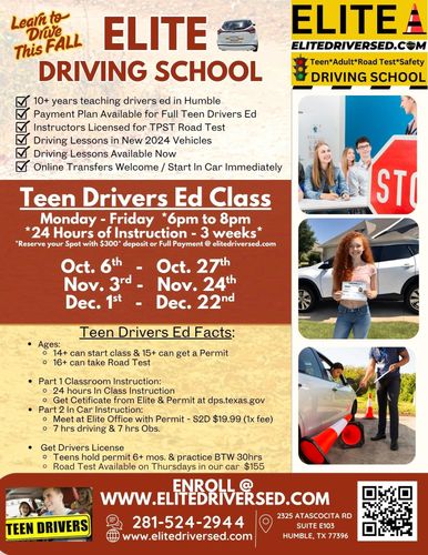 Times are tough for everyone! Driving Schools are no exception. Elite Driving School has served Humble since 2012 & welcomes you to complete drivers ed with us, if your driving school has closed. We will offer a discount, so you are not paying full price for drivers ed twice! Get Licensed with Elite! Text 281.524.2944